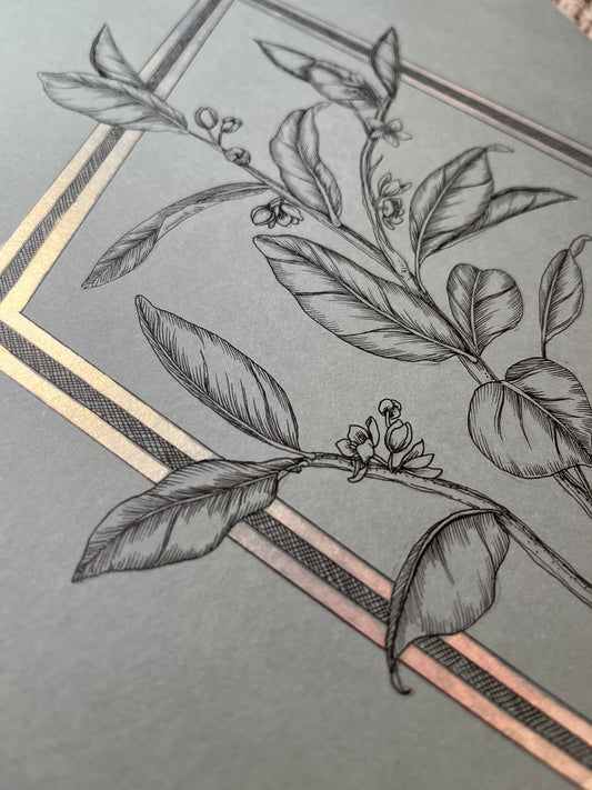 Art - Leafy Art Deco Drawing with Metallic Frame - Original Ink Drawing